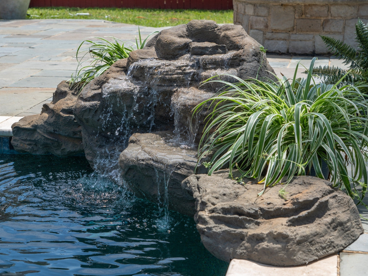 Add the calming sound of water and natural stone beauty to even the smallest pool spaces with this compact, corner-friendly waterfall design.