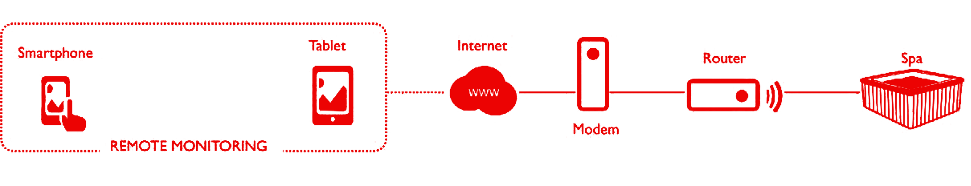 Tablet/Phone connects via the internet to your home router then communicates to the spa with your home WiFi signal.